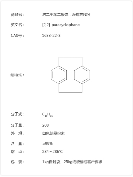 是一种很好的介电材料,具有非常低的介质损耗、高绝缘强度以及不随频率变化的介电常数。它是所有Parylene中穿透能力较高的一种。很好的自润滑性。摩擦系数为0.25.符合环保要求。符合ISO-10993生物试验要求。